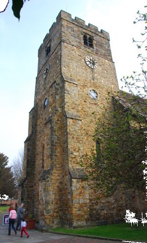 The distinctive Norman Tower of our own church. This originally ended just above the clock, and was fur-ther extended in the 15th Century, leaving a marked difference in the brickwork.